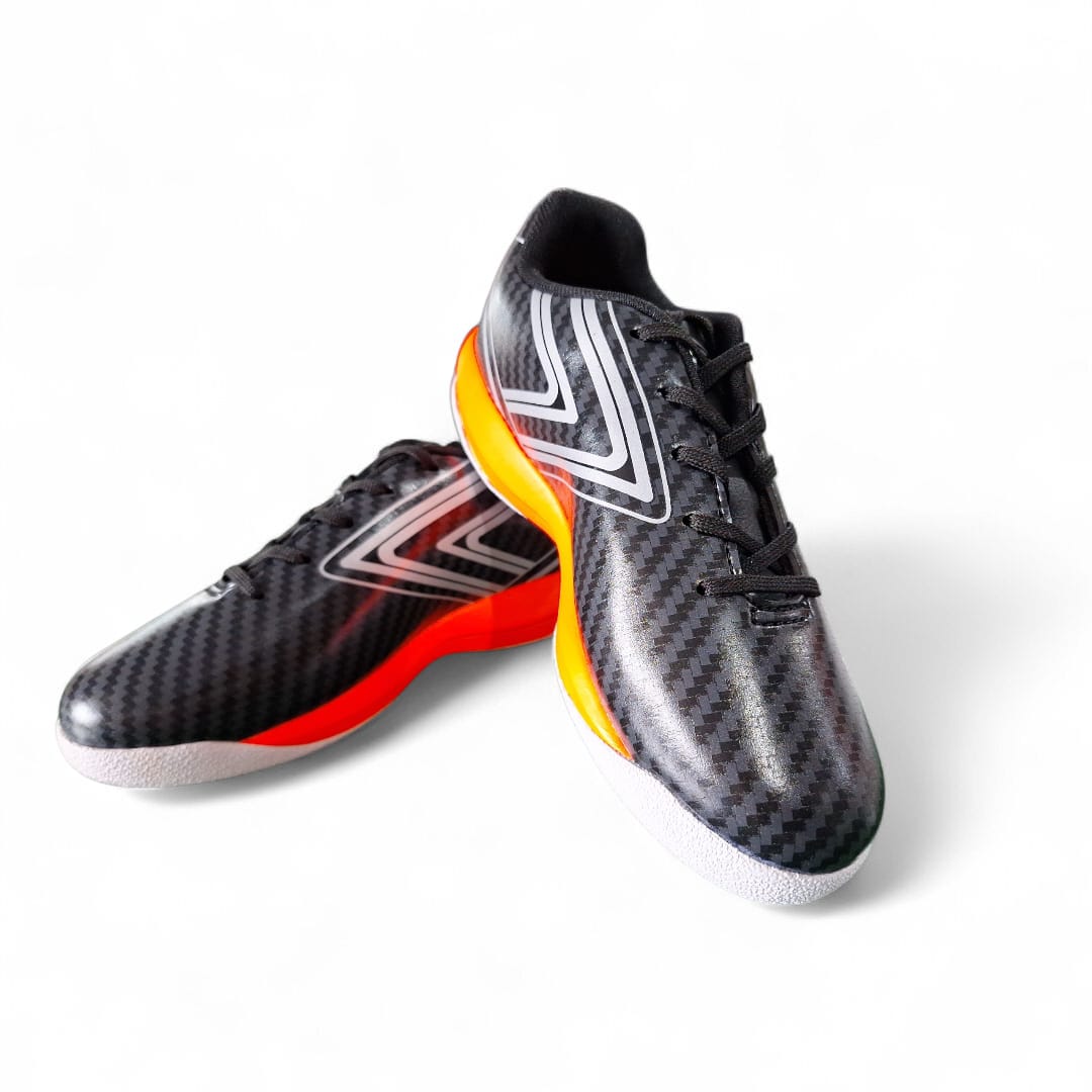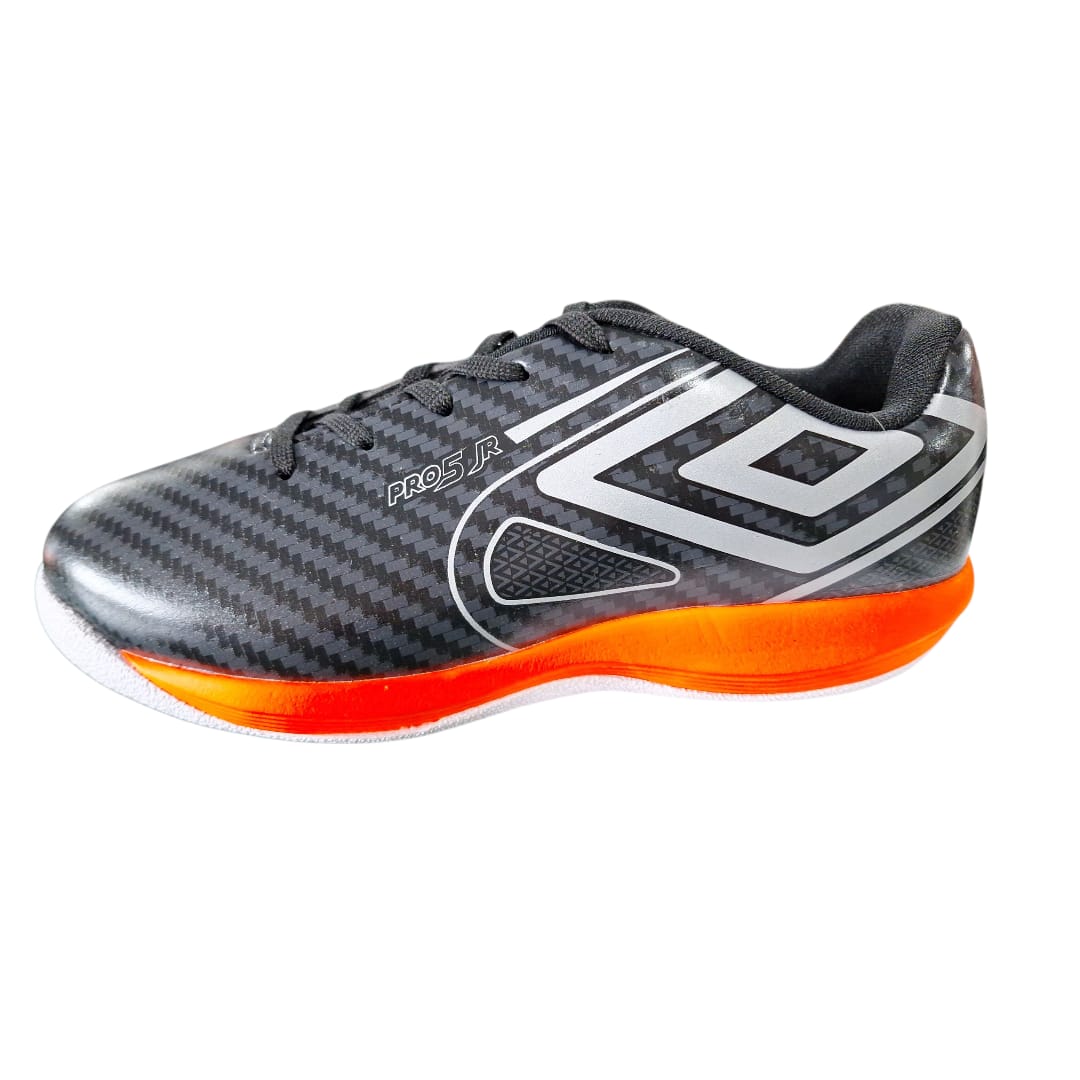 Domine as quadras com estilo e desempenho usando a **Chuteira Futsal Umbro Pro 5**. Com um visual moderno nas cores preto, prata e laranja, ela é a escolha certa para jogadores que exigem conforto, controle e velocidade nos movimentos.